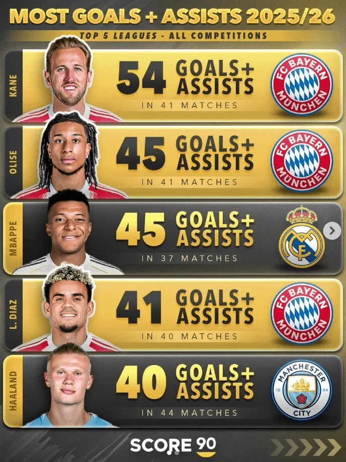 虎扑04月08日讯 Score 90盘点了本赛季五大联赛各项赛事参与进球最多的球员,详情如下: